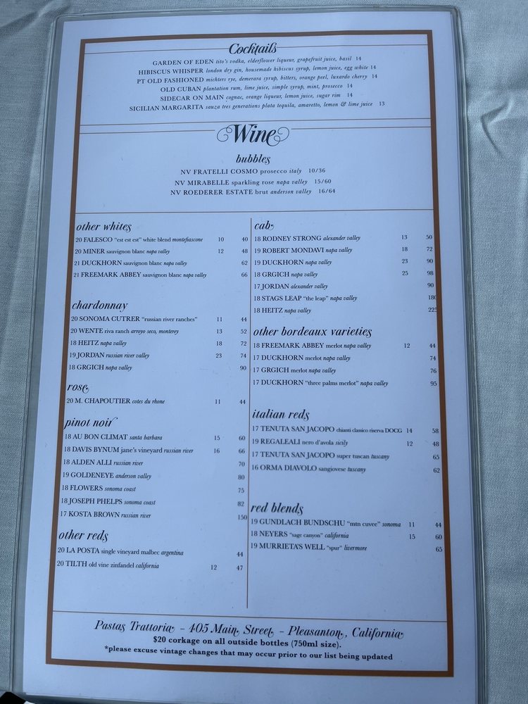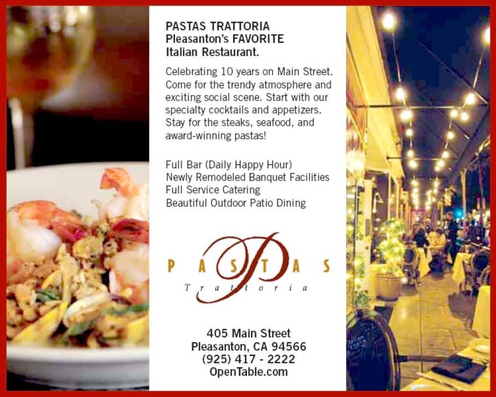 Introducing Pastas Trattoria, a cocktail bar and Italian restaurant located in Pleasanton, CA. This unclaimed gem offers a variety of amenities such as outdoor seating, free Wi-Fi, and a full bar. With options for reservations, takeout, and delivery, this restaurant is perfect for groups, families, or a romantic dinner. The menu features authentic Italian dishes, with pasta being the star of the show. From classic favorites like spaghetti Bolognese to unique creations like truffle mushroom ravioli, there is something for every pasta lover. The atmosphere is classy yet casual, making it ideal for any occasion. Don't miss out on the best nights to visit, Fridays and Saturdays, for a chance to enjoy good food, drinks, and maybe even some dancing. Pastas Trattoria is a must-visit for Italian cuisine enthusiasts.